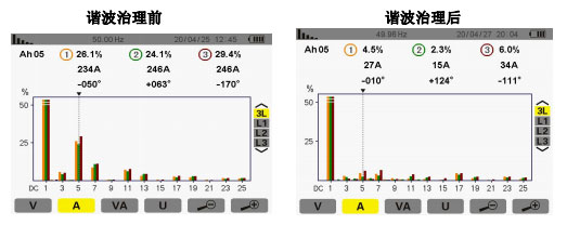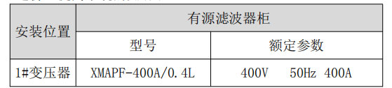 4.2 現(xiàn)場電能質(zhì)量選型和制訂 首先,要保證功率因數(shù)要達到要求,諧波治理方案要能夠保障主要諧波吸收或抵 消目的的實現(xiàn),要保障諧波治理設(shè)備投入使用后系統(tǒng)電路內(nèi)的諧波量 對設(shè)備影響較小;其次,系統(tǒng)改進方案要保障裝置自身的安全性。動 力柜穩(wěn)定電流按照正常 30%的設(shè)計要求使用 400A 有源濾波器可以治 理設(shè)備的諧波. 這個安全性主要是指在系統(tǒng)當前存在的諧波電流、電壓的背景下,有 第三,需要設(shè)計方案的性價比,在可能的情況下盡量降低系統(tǒng) 造價,提高系統(tǒng)的實用性;