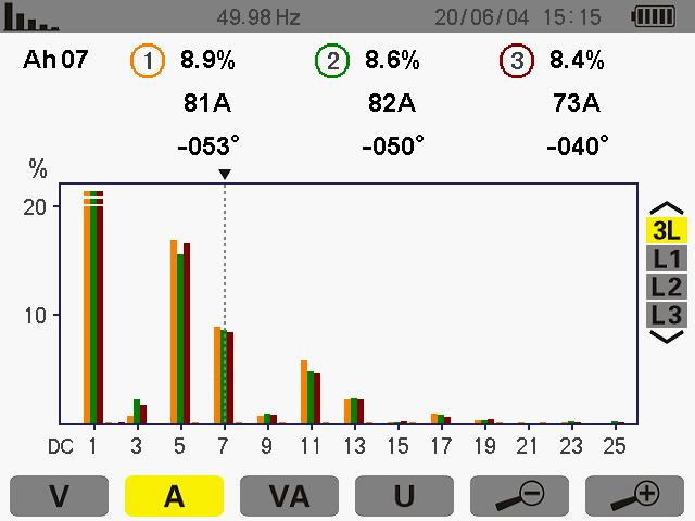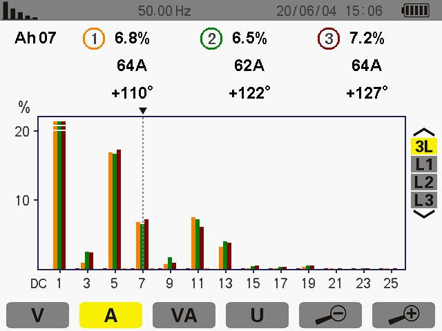 此次測量為7次諧波其ABC的THD值為 6.8% 6.5% 7.2%諧波電流為 64A 62A 64A。