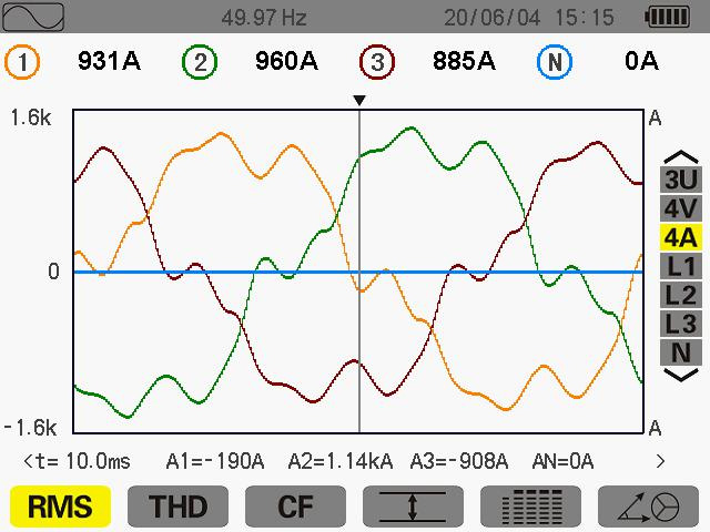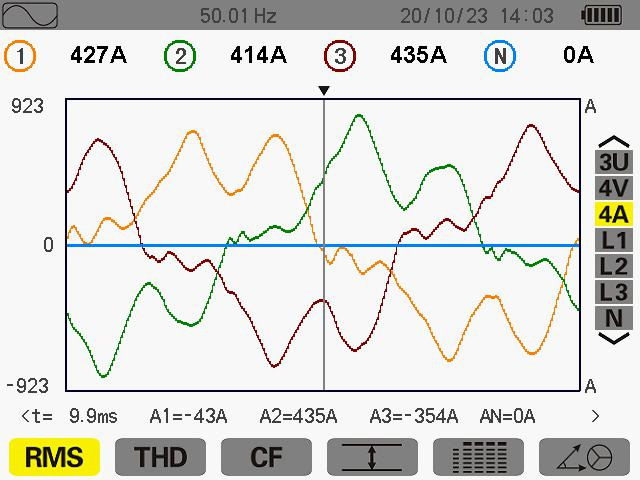 此次測量在其 ABC 電流分別為 427A 414A 435A 當天生產(chǎn)使用其變壓器為60%,未滿負載運行中。